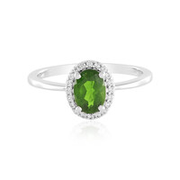 Découvrez l'allure enchanteresse de cette bague en argent 925 plaqué platine, mettant en valeur un luxueux diopside russe ovale de 0,765ct entouré de zircons cambodgiens étincelants. La teinte verte vibrante du diopside, combinée au brillant halo de zircon, crée un contraste visuel stupéfiant destiné à charmer et à captiver. Idéale pour ajouter une touche d'élégance aux tenues de jour et de soirée, cette bague promet d'être un ajout polyvalent à toute collection de bijoux.